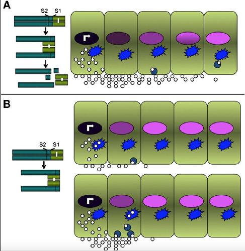 Fig. 1. Model for regulation of BMP4 signaling by sequential cleavage. (A) When proBMP4 is sequentially cleaved at the S1 and then the S2 sites, the mature ligand is released from the cleaved prodomain and is relatively stable, enabling it to signal to distal cells. (B) When proBMP4 is cleaved at the S1 site alone, the mature ligand remains non-covalently associated with the prodomain and this complex is targeted for degradation in the lysosome (blue shape) either directly within the biosynthetic pathway of synthesizing cells (upper panel) or via endocytic targeting in signal receiving cells (lower panel). This lowers the rate of ligand production at the source and/or enhances the rate of ligand degradation in receiving cells. As a result, BMP4 generated by cleavage at the S1 site alone signals is present at lower steady state levels.