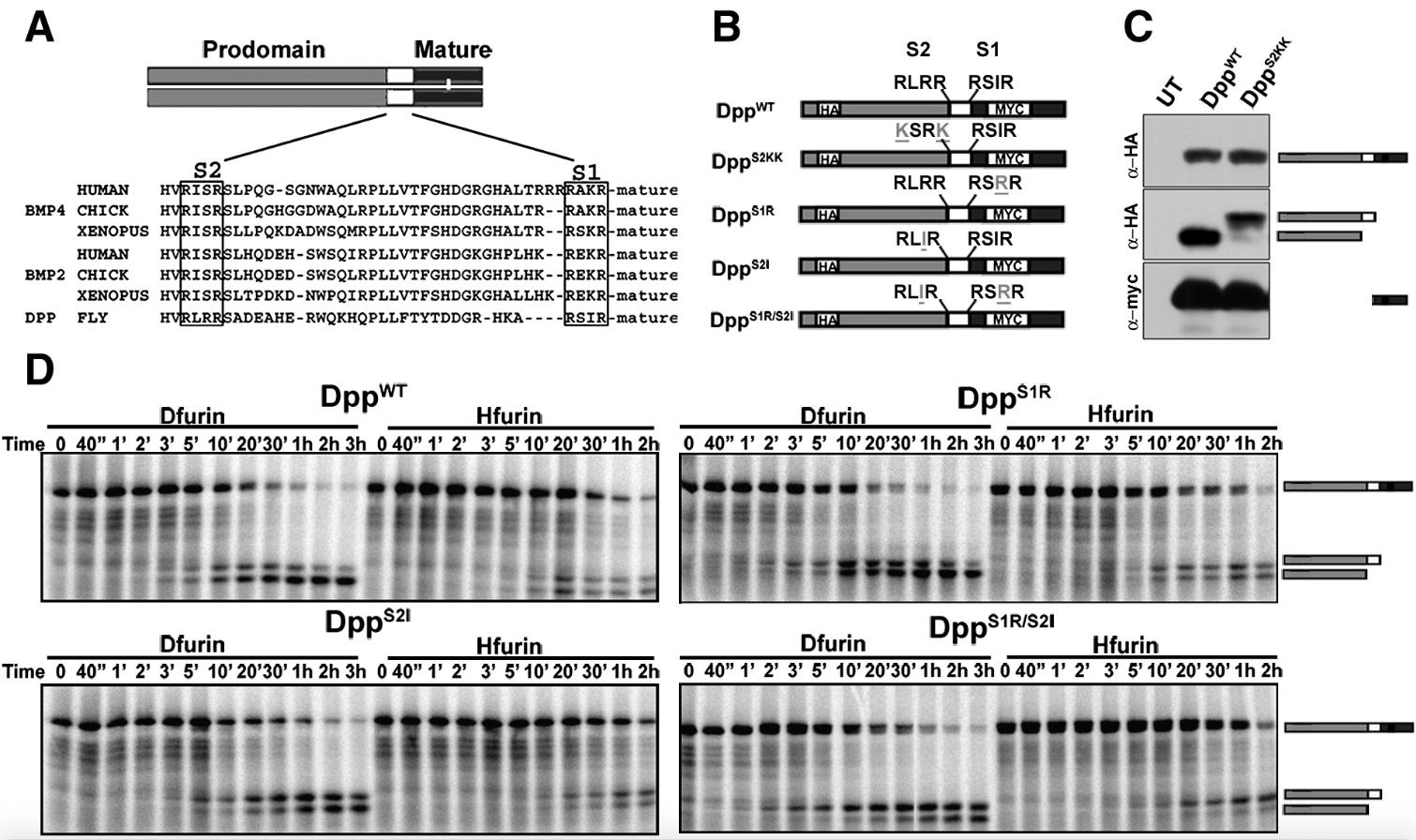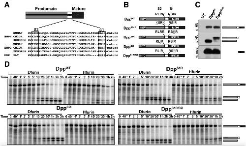 Fig. 2. Dpp is cleaved at two sites within the prodomain. (A) Alignment of sequences flanking the cleavage site(s) of BMP4 and BMP2 from human, chick and Xenopus (Xen), and DPP from Drosophila (fly). (B) Schematic illustration of cleavage sites in wild type and cleavage variant forms of proDpp. Shaded bar represents the prodomain, white bar the region between the two cleavage sites and black bar the mature ligand domain. (C) Dpp precursors were expressed in S2 cells and Western blots of cell media were probed with antibodies specific for the HA-tag in the prodomain or the myc-tag in the mature domain. Bands corresponding to uncleaved precursor, prodomain following cleavage at the S1 site, prodomain following cleavage at the S2 site, and mature ligand are indicated schematically to the right of the gel. The same bands were observed in Western blots of cell lysates. (D) Radiolabeled native or cleavage mutant forms of proDpp were incubated with recombinant Dfurin or Hfurin for the times indicated. All results were reproduced in at least three independent experiments.