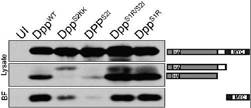 ???displayArticle.abstract??? BMP4 is synthesized as an inactive precursor that is cleaved at two sites during maturation: initially at a site (S1) adjacent to the ligand domain, and then at an upstream site (S2) within the prodomain. Cleavage at the second site regulates the stability of mature BMP4 and this in turn influences its signaling intensity and range of action. The Drosophila ortholog of BMP4, Dpp, functions as a long- or short-range signaling molecule in the wing disc or embryonic midgut, respectively but mechanisms that differentially regulate its bioactivity in these tissues have not been explored. In the current studies we demonstrate, by dpp mutant rescue, that cleavage at the S2 site of proDpp is required for development of the wing and leg imaginal discs, whereas cleavage at the S1 site is sufficient to rescue Dpp function in the midgut. Both the S1 and S2 sites of proDpp are cleaved in the wing disc, and S2-cleavage is essential to generate sufficient ligand to exceed the threshold for pMAD activation at both short- and long-range in most cells. By contrast, proDpp is cleaved at the S1 site alone in the embryonic mesoderm and this generates sufficient ligand to activate physiological target genes in neighboring cells. These studies provide the first biochemical and genetic evidence that selective cleavage of the S2 site of proDPP provides a tissue-specific mechanism for regulating Dpp activity, and that differential cleavage can contribute to, but is not an absolute determinant of signaling range.