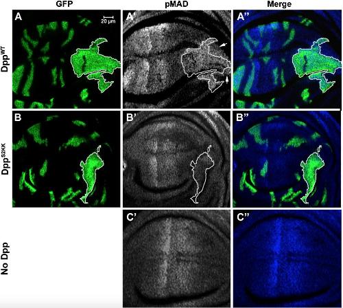 Fig. 5. Cleavage of Dpp at the S2 site is required for activation of pMAD in the wing disc. Wing discs with clones of cells (marked by GFP) expressing proDppWT (AâAâ³) or proDppS2KK (B-Bâ³) were immunostained to detect pMAD. Endogenous pMAD staining in the absence of ectopic Dpp is also shown (Câ², Câ³). Representative clones outside of the endogenous dpp expression domain are outlined. Arrows denote induction of pMAD outside of clones.