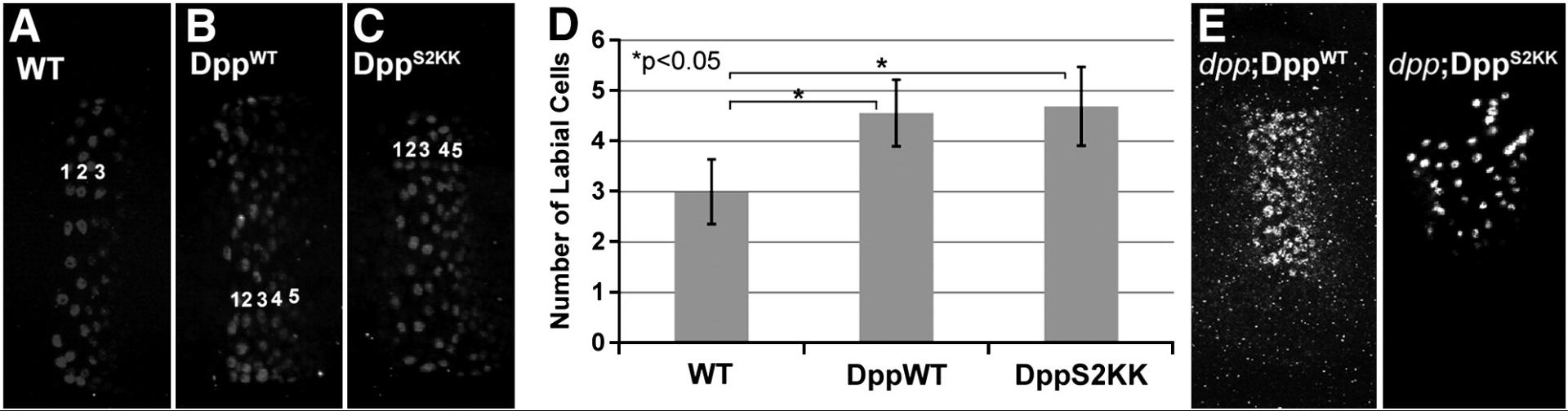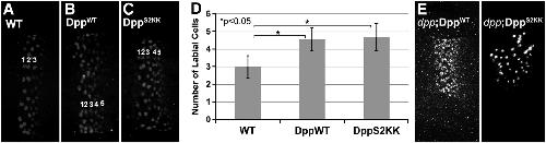 Fig. 6. Cleavage at the S2 site is not required for ectopic expression of labial in the midgutprimordium. (AâC) Stages 14â15 nontransgenic embryos (WT), or those expressing DppWT or DppS2KK precursors using the mesodermal driver 24B-Gal4 were immunostained to detect Labial expression in the midgutendoderm. (D) Quantification of labial stripe width. Values represent the mean number (+/â s.d.) of labial expressing cells in a stripe. The width of the labial stripe in WT embryos was significantly different than that in embryos expressing DppWT or DppS2KK precursors (p < 0.05) but there was no significant difference in the number of labial cells between embryos expressing DppWT or DppS2KK precursors. (E,F) dppS4 homozygous embryos expressing either proDppWT or proDppS2KK immunostained to detect labial expression in the endoderm.