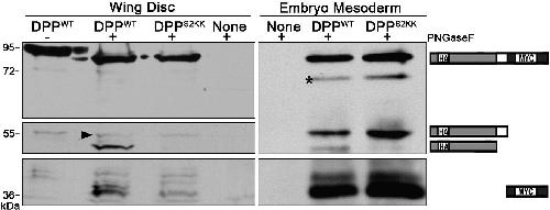 Fig. 7. The S2 site of proDpp is selectively cleaved in the wing disc, but not in the embryonic mesoderm. Western blots of proteins from pooled wing disc extracts or from embryo immunoprecipitates derived from nontransgenic flies (none) or from transgenic flies expressing proDPPWT or proDPPS2KK were probed with antibodies specific for the HA-tag in the prodomain or the myc-tag in the mature domain of each precursor protein. Bands corresponding to uncleaved precursor, prodomain fragments and mature ligand are indicated to the right of the gel. The top and middle panels on the left are short and long exposures, respectively, of the same Western blot. The upper mature ligand bands detected with the anti-myc antibody are most likely due to incomplete deglycosylation (based on predicted molecular weight of S1 cleaved mature Dpp and comparison with duplicate protein extracts that had not been deglycosylated with PNGaseF, as indicated at the top of the gel). Bands indicated by an asterisk are most likely precursor degradation products. The arrowhead indicates the faint band corresponding to S1-only cleaved prodomain generated from DPPWT in the wing disc.