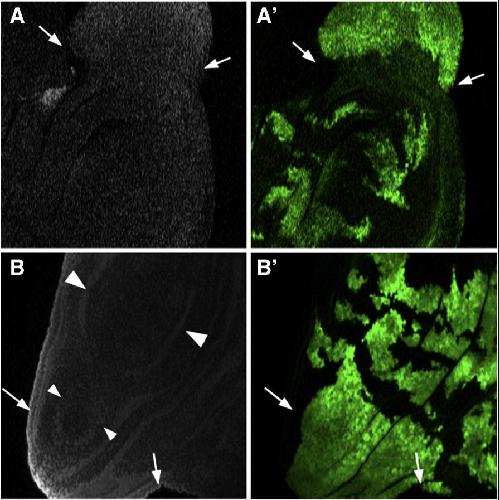 Fig. S3. Dpp generated from proDPPS2KK can induce localized overgrowth of the wing disc when clones abut the periphery. Autofluorescence (A,B) and GFP imaging (Aâ²,Bâ²) of wing discs with large clones of cells (marked by GFP) expressing proDppS2KK. Arrows indicate the borders of the expanded region of the wing disc induced by ectopic Dpp. In (B), overgrowth is also apparent in the folding pattern of the expanded portion of the disc (small arrowheads) that resembles the normal pattern (large arrowheads).