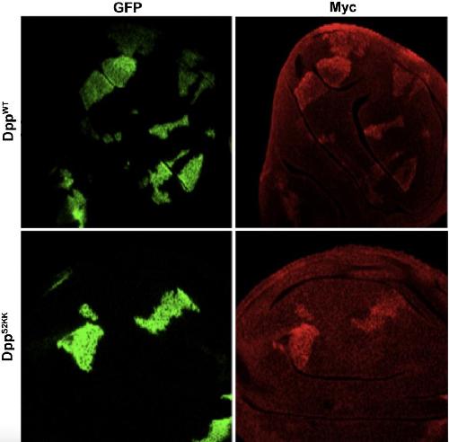 Fig. S4. Immunoreactive Dpp is present in clones of cells expressing wild type and S2KK-mutant precursors. Wing discs with clones of cells (marked by GFP) expressing proDppWT or proDppS2KK were permeabilized and immunostained to detect myc.