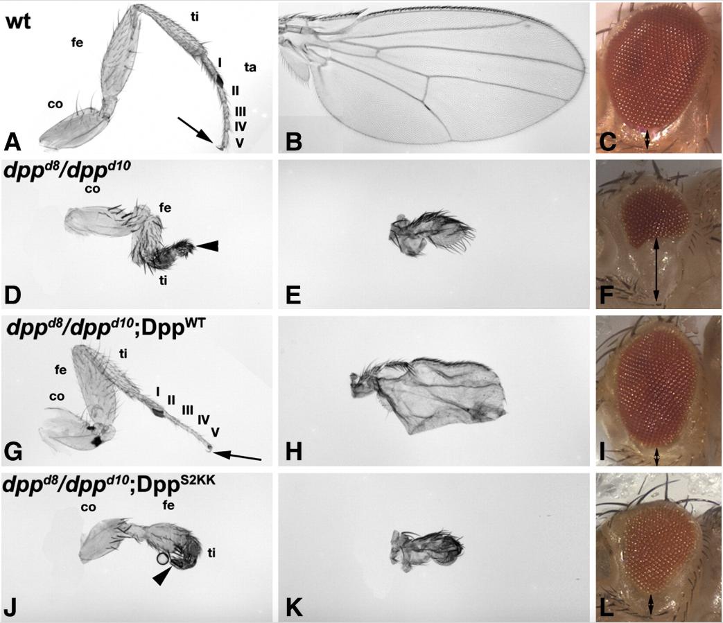 Fig. 4. Cleavage of the S2-site is required for normal wing development. Normal leg (A), wing (B) and eye (C) formation in wild type (wt) flies is contrasted with that in dppd8/dppd10 mutant flies that have truncated legs (D) tiny winglets (E) and ventrally receding eyes (F). Expression of UAS-DppWT-myc under the control of dpp-Gal4 fully rescued leg (G) and eye (I), and partially rescued wing development (H) in all dppd8/dppd10 mutants. UAS-Dpp-mycS2KK did not rescue the truncated legs (J) or missing wings (K) in any flies but partially rescued ventraleye development in almost all flies examined (L). Double arrows (C, F, I and L) indicate the distance from the ventraleye margin to the bristles in wild type, mutant and rescued animals. Arrows (A, G) indicate the claws whereas arrowheads (D, J) highlight distal truncation with loss of tarsal segments. Co, cox; fe, femur; ti, tibia; ta, tarsus with segments IâV.