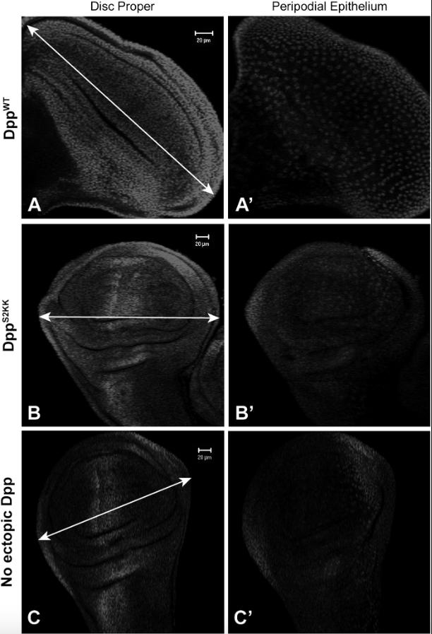 Fig. S2. Cleavage at the S2 site is required for Dpp to induce overgrowth of the wing disc. (AâC) Wing discs dissected from transgenic flies expressing proDppWT (AâAâ²) or proDppS2KK (BâBâ²) under the control of Ubx-GAL4, or from nontransgenic flies (CâCâ²) were immunostained to detect pMAD. Horizontal images of pMAD staining were obtained at the level of either the Disc proper (DP) (AâC) or the peripodial epithelium (PE) (Aâ²âCâ²) using confocal microscopy. Arrows indicate the relative width of discs along the AâP axis.