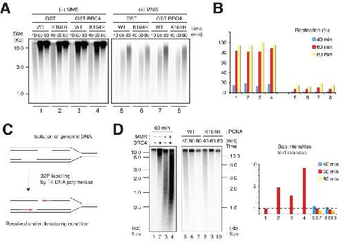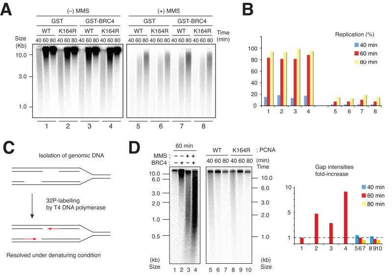 Figure 2. Rad51 and PCNA modifications in DNA replication and ssDNA gap accumulation. (A) Rad51 and PCNA requirement for replication of untreated and MMS-treated DNA. Sperm nuclei were incubated in 10 μl egg extract with α32P-dATP for the indicated times in the presence or absence of 0.7 mg ml−1 GST or GST-BRC4 and MMS (− or +), and 0.2 mg ml−1 of recombinant wild type PCNA (WT) or mutated PCNA (K164R). Replication products were resolved on 1% (w/v) alkaline agarose gel and subjected to autoradiography. (B) The signal intensities obtained in (A) were quantified and reported on the graph. The experiments shown represent a typical result. (C) Gap labelling procedure using T4 DNA polymerase. Replicating genomic DNA was isolated and used as a template for gap-filling assay using T4 DNA polymerase. The labelled nascent molecules extended by T4 were then resolved on alkaline agarose gel. (D) Untreated (−MMS) and MMS treated (+MMS) sperm nuclei were incubated in 10 μl of egg extract in the presence of GST or GST-BRC4 for 60 min (1–4). Untreated sperm nuclei were incubated for 40, 60 or 80 min in the presence of PCNA-WT or PCNA-K164R (5–10). Genomic DNA was isolated and subjected to the gap labelling reaction followed by autoradiography. Exposure times are equivalent for the 2 gels although kinetic profile starts at 40 minutes in 5–10. The graph shows the relative fold increase in optical density measured for each lane taking as reference untreated chromatin recovered at 60 minutes. The experiment shows a typical result.