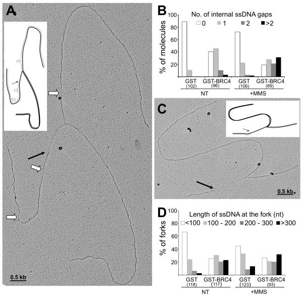 Figure 3. Rad51 is required to prevent replication fork uncoupling and ssDNA accumulation on damaged and undamaged templates. (A) and (C) Electron micrographs (and schematic drawings) of representative RIs isolated from sperm nuclei, incubated in GST-BRC4 treated extracts. Black arrows point to ssDNA regions at the replication fork. White arrows point to ssDNA gaps along the replicated duplexes (internal gaps). (B) Statistical distribution of internal gaps in the analyzed population of molecules. The total number of molecules analyzed is indicated in brackets. (D) Statistical distribution of ssDNA length at replication forks isolated in the indicated conditions. The total number of forks analyzed is indicated in brackets.
