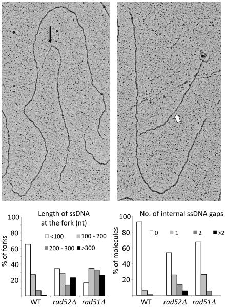 Figure 4. Accumulation of ssDNA gaps in the absence of Rad52 and Rad51 in S. cerevisiae.Upper panels: Electron micrographs of a representative RIs isolated from rad52 mutant S. cerevisiae growing cells. The black arrow points to an extended ssDNA regions at the replication fork. White arrows show ssDNA gap behind the fork. Lower panels: Statistical distribution of ssDNA gap length (left) and of the number of ssDNA gaps (right) observed on RIs isolated from wild type, Rad52 and Rad51 mutant S. cerevisiae growing cells.