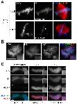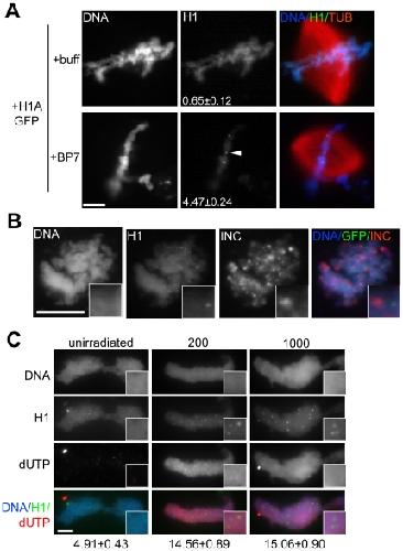 Figure 3. RanBP7 Reveals H1 Foci.(A) Identically-scaled fluorescence images of fixed metaphase spindles from CSF reactions supplemented with 1 µM H1A-GFP and 4 µM RanBP7 or buffer control (+buff). In the presence of RanBP7, H1A-GFP is reduced on chromatin and concentrates on chromatin in small foci (arrowhead). The number of foci per nucleus (average ± standard error, n>40) is shown in the H1A-GFP column. (B) H1A-GFP foci do not colocalize with the centromere marker INCENP (INC). INCENP localization was performed using replicated chromosomes, on which H1A-GFP foci were less obvious but still detectable (insets). (C) Immunofluorescence images of UV-irradiated or unirradiated sperm nuclei assembled into chromatin in metaphase extracts supplemented with H1A-GFP, RanBP7, and biotin-dUTP. Insets are provided and the number of foci per nucleus is shown below the column for each condition. Scale bars, 10 µm.