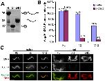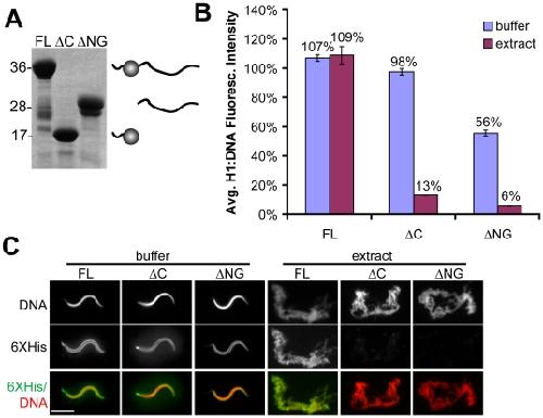 Figure 4. Effect of Cytoplasm on H1M and Domain Truncation Mutants.(A) Coomassie-stained gel of full-length (FL) H1M, amino-globular domains (ΔC), and C-terminal domain (ΔNG), with schematic of the proteins shown at right of the corresponding band. (B) Quantification of H1:DNA fluorescence intensity (average ± standard error) and (C) representative immunofluorescence images of sperm chromatin in buffer or extract supplemented with 1 µM H1M full-length or domains. In extract, full-length H1 localizes as efficiently as it does in buffer, while a sharp drop in localization intensity is observed for the domains. H1 was immunolocalized using the 6XHistidine tag (6XHis) common to all three constructs. For visualization purposes, DNA and H1 signal were brightened in the extract condition relative to buffer. Scale bar, 10 µm.