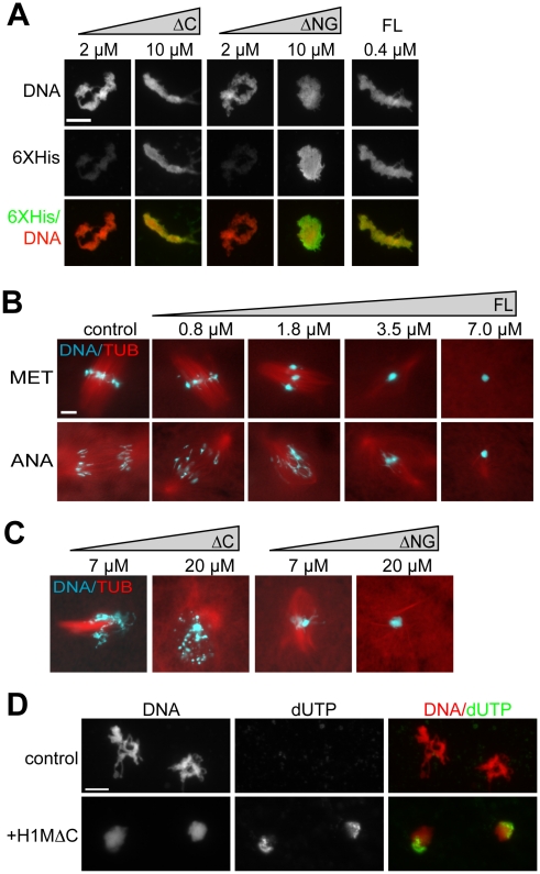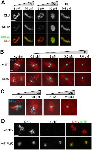 Figure 5. Overexpression Phenotypes of H1 Full Length and Domain Truncations in Extract.(A) Anti-6XHistidine immunofluorescence of chromosome clusters from reactions supplemented with increasing concentrations of amino-globular (ΔC) or C-terminal (ΔNG) H1M truncation mutants, or 0.4 µM H1M full-length (FL) as a control. Truncation mutants required much higher concentrations for efficient localization. (B) Squash fix of chromatin and rhodamine-labeled microtubules (TUB) in egg extracts supplemented with increasing concentrations of full-length H1M. Added at prophase, H1M compacts the condensing metaphase chromosomes (MET) into a single mass within aberrant spindles. Such hypercondensed chromosomes are unable to segregate during anaphase (ANA). (C) Metaphase reactions supplemented with amino-globular or C-terminal domains at high concentrations. H1MΔC causes chromosome fragmentation, while H1MΔNG causes mitotic chromosomes to compact into a single mass. (D) Representative, identically-scaled fluorescence images of sperm chromatin incubated in CSF egg extracts supplemented with biotin dUTP with or without 20 µM H1MΔC. Morphological chromatin fragmentation was less obvious using the immunofluorescence protocol, but was observed in squash samples from these reactions. Scale bars, 10 µM.