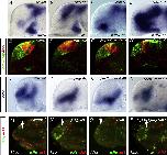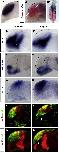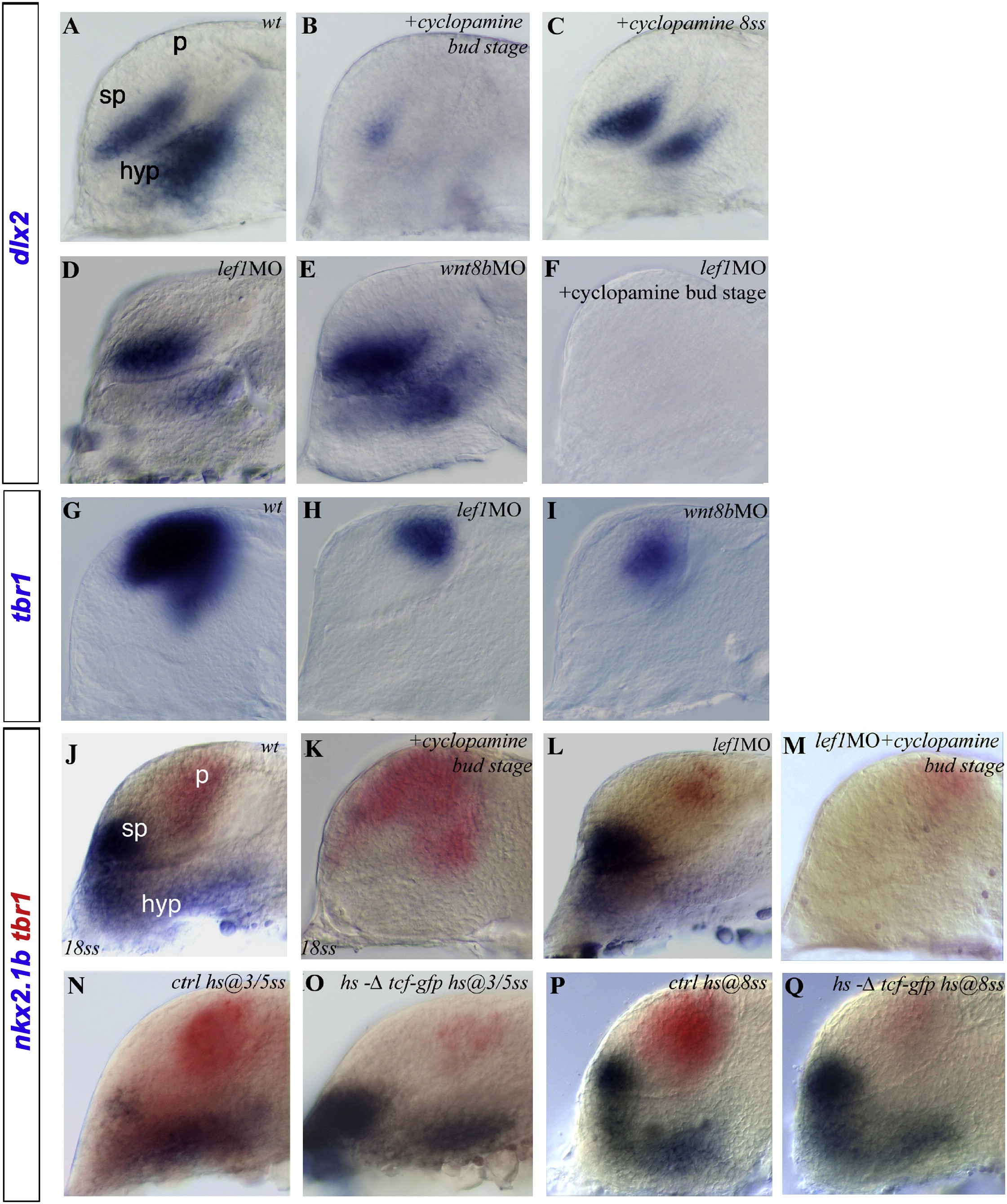 Figure 1. Shh and Wnt Signaling Activities Independently Regulate the Establishment of the Dorsoventral Axis in the Telencephalon(AâQ) Here, as in all subsequent panels, embryos are shown in lateral view, with anterior oriented toward the left and dorsal oriented toward the top unless stated otherwise. Treatments and/or MO injected in embryos are indicated in the top right corners. Embryos are at the 22ss, except when stated otherwise (bottom left of the picture). Expression of (AâF) dlx2 and (JâQ) nkx2.1b (blue) and of (GâI and JâQ) tbr1 (red and blue) in (A, G, J, N, and P) WT/control, cyclopamine-treated embryos at the (B and K) bud or the (C) 8ss, (D, H, and L) the lef1 morphant, the (E and I) wnt8b morphant, (F and M) lef1 morphants treated with cyclopamine at the bud stage, and hs-δtcf-gfp transgenic embryos heat shocked at the (O) 3ss and the (Q) 8ss embryos. hyp, hypothalamus; sp, subpallium; p, pallium.
