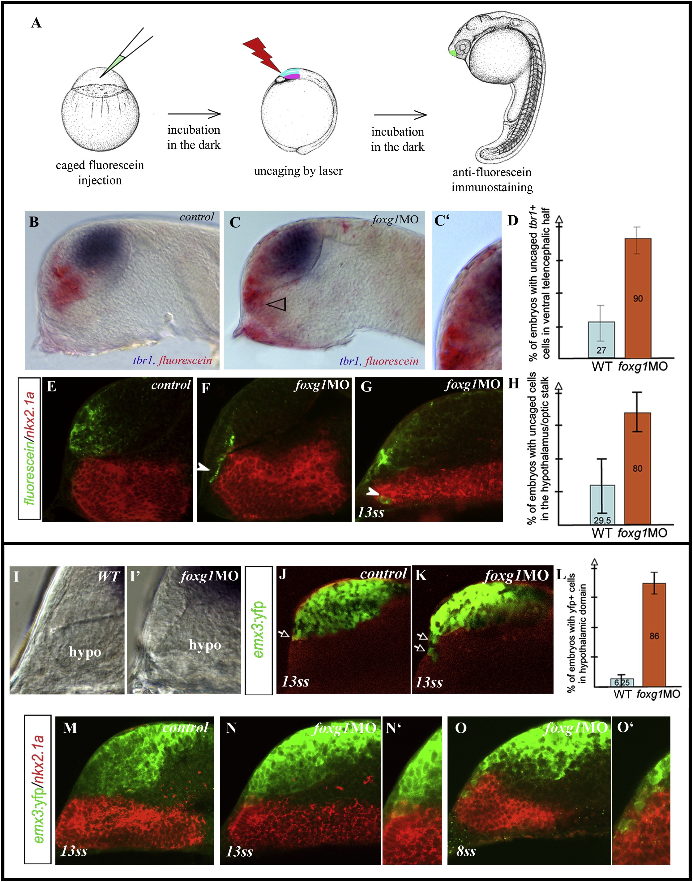 Figure 3. Prospective Subpallial Precursors Adopt the Pallial Fate or Move into Basal Territory in foxg1 Morphants(AâH) Uncaging experiments. (A) Schematic of the experimental procedure. The telencephalic anlage is indicated in bright blue, and the hypothalamus is indicated in pink. Fluorescein uncaged cells in (B and E) control or (C, F, and G) foxg1MO embryos are detected (in red in [B] and [C] or in green in [E]â[G]) in parallel to (B and C) tbr1 (blue) or (EâG) nkx2.1a (red, confocal sections). The quantification of fluorescein+ cells coexpressing tbr1 in the ventraltelencephalon in control or foxg1 morphants with standard deviation is shown in (D). Fluorescein+ cells in the hypothalamus/optic stalk region (arrowheads) are quantified in (H).(I and Iâ²) Close-up of the rostral forebrain by using Nomarski optic in (I) control and (Iâ²) foxg1 morphant embryos.(JâOâ²) Confocal sections of (MâOâ²) Tg(emx3:YFP) with YFP in green and nkx2.1a in red, in (J and M) control, or (K, N, and O) foxg1MO embryos. (L) Quantification of YFP+ cells in the hypothalamic domain.