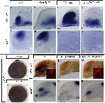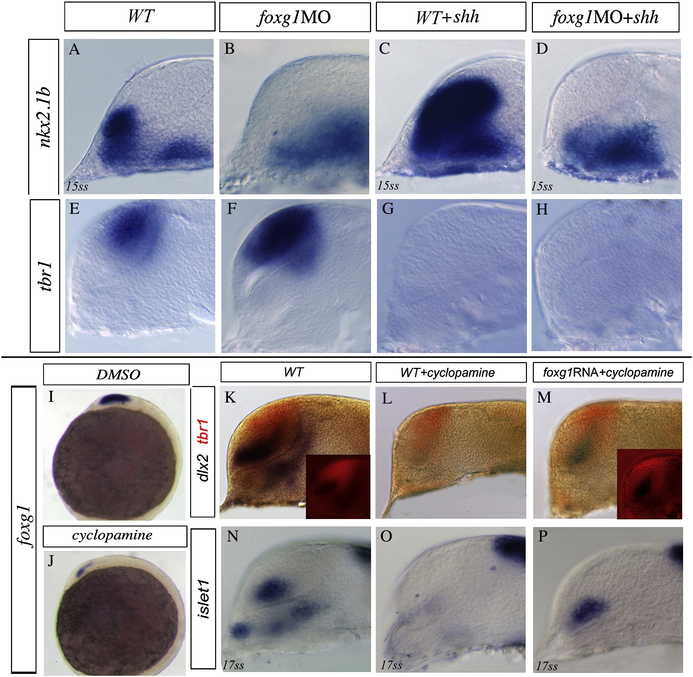 Figure 4. Foxg1 Functions Downstream of Shh Activity to Induce Subpallial Character(AâP) The markers analyzed are indicated on the left of each row. The identity of the embryos is indicated on top of each column. (AâH) Expression of (AâD) nkx2.1b and (EâH) tbr1 when shh is overexpressed in (C and G) WT or in (D and H) foxg1 morphants, compared to (A and E) WT or (B and F) foxg1 morphants. (I and J) Foxg1 expression in the (I) 5ss control or in (J) embryos treated with cyclopamine at bud stage. (KâP) Effects of cyclopamine treatment at the bud stage in (L and O) WT or (M and P) foxg1-overexpressing embryos on dlx2 and islet1 compared to (K and N) untreated WT. (KâM) Telencephalon is highlighted by tbr1 expression in red (insets).