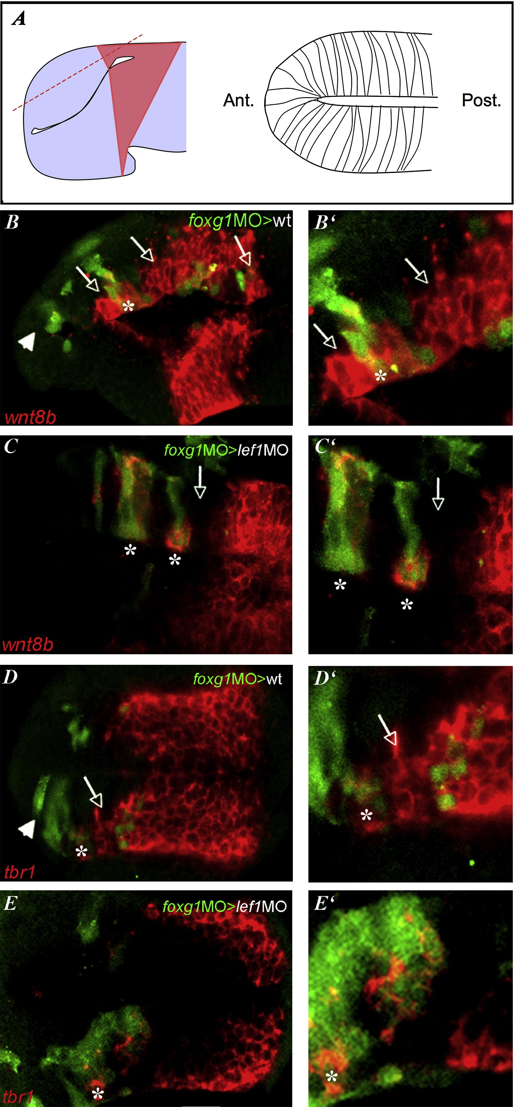 Figure 6. Foxg1 Loss of Function Acts Cell Autonomously and Nonautonomously for the Restriction of Pallial Identity(AâEâ²) All embryos are at the 20ss. All panels show telencephalic dorsal views; anterior is oriented toward the left. The right column shows high magnification of the images on the left. (A) Schematic explaining the plan of section of the confocal images below. The normal wnt8b expression domain is pale red. (BâE) Confocal images of mosaic embryos with transplanted foxg1MO cells in green and (BâCâ²) wnt8b or (DâEâ²) tbr1 expression in red. Asterisks indicate foxg1MO cells, and arrows show neighboring host cells. Host embryos are (B, Bâ², D, and Dâ²) WT or (C, Câ², E, and Eâ²) lef1 morphants. The arrowhead in (B) and (D) indicates the foxg1MO cells located in the ventraltelencephalon.