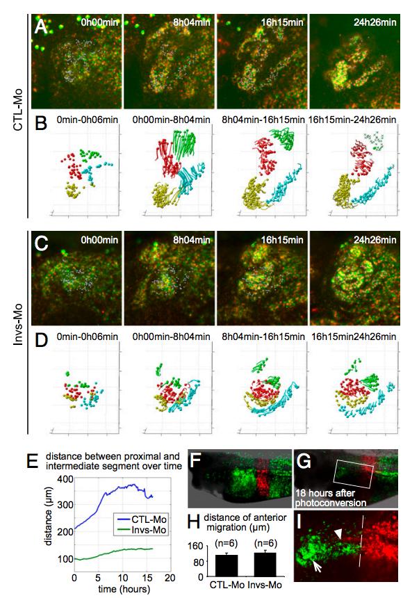 Fig. 2. Inversin affects morphogenetic movements during ventral extension of the proximal pronephros. (AâE) Abnormal ventral extension of the Inversin-depleted pronephros. (AâD) Time-lapse confocal microscopy of pronephros morphogenesis was performed in parallel between CTL-Moâ and Invs-Moâinjected Xenopus embryos to monitor cell movements within the developing proximal pronephros. Cells were labeled by membrane-GFP and nuclear-RFP; only cells clearly identifiable as part of the pronephros were tracked (white dots in A and C). Clustering of cells with similar movements (green, red, yellow, and blue balls in B and D) was performed automatically; their trajectories over the indicated time are depicted in B and D. Cells that left the focal plane are depicted as crosses. (Scale bar: 100 μm.) (E) The distance between green (corresponding to the proximal segment) and yellow (intermediate segment) cell clusters in micrometers over time (hours). In contrast to CTL-Moâinjected embryos (blue line), the distance between these two cell clusters failed to increase in Invs-Moâinjected embryos during the first 6 h (green line), causing the abnormal ventral extension of the Inversin-depleted pronephros. (FâI) Distal to proximal cell migration is unaffected by Inversin depletion. (F) The photo-convertible fluorophore Kaede was broadly expressed in Xenopus embryos injected with either CTL- or Invs-Mo. Photoconversion from green to red was restricted to a stripe at stage 34. (G) At stage 39 (18 h after photoconversion), red fluorescent cells extended from the red stripe in a proximal direction. (I) Enlargement of the boxed area in G. The dashed line marks the left-side boundary between the photo-converted area and surrounding tissue. The white arrowhead indicates red fluorescent distal tubule cells that migrated in a proximal direction. The arrow points to the pronephric tubule convolute. (H) Measurements of anterior migration in micrometers in CTL- and Invs-Moâinjected Xenopus embryos. Error bars represent SEM. |