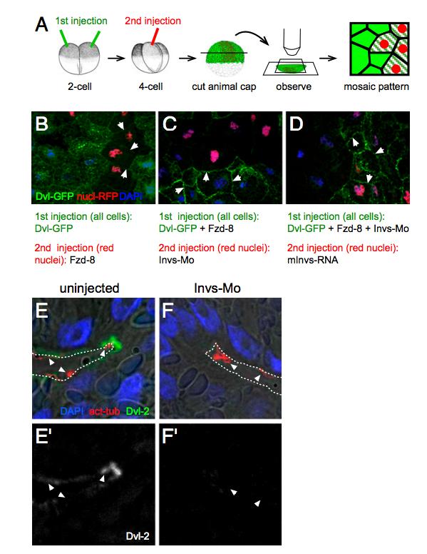 Fig. 5. Inversin is required for membrane localization of Dishevelled. (A) Mosaic cell clusters in animal caps were generated by sequential injection at the two- and four-cell stage. All cells received a first injection at the two-cell stage that included Dishevelled-GFP. A subset of these cells received a second injection at the four-cell stage; only cells modified by the second injection are marked by red nuclei expressing histone-2Bâred fluorescent protein (H2BRFP). Thus, neighboring mosaic cell clusters with different injections can be compared based on the presence or absence of red nuclei. (B) Dishevelled-GFP, localized in a typically punctuate pattern (first injection, all cells), is recruited to the plasma membrane in Frizzled-8 (Fzd-8)âinjected cells (second injection, cells with red nuclei). (C) Fzd-8âinduced membrane localization of Dishevelled (first injection, all cells) is abolished in the subset of cells that received the InvsMo in a second injection (second injection, cells with red nuclei). (D) Defective membrane recruitment of Dishevelled after injection of Dishevelled-GFP, Fzd8, and Invs-Mo (first injection, all cells) can be rescued by mouse Inversin RNA injection (second injection, cells with red nuclei). DAPI staining (blue) visualizes all cell nuclei. White arrows point to membrane-localized Dishevelled. (E and F) In immunostaining of stage-36 embryos, Dishevelled-2 (green) localizes to the membrane of tubular epithelial cells indicated by the presence of cilia (acetylated tubulin in red, white arrowheads). A dashed line indicates the apical surface of the pronephric tubule; nuclei are stained with DAPI (blue). The Invs-Moâinjected side shows a strong reduction of Dishevelled-2 staining at the apical membrane of the pronephric tubules. The Dishevelled channel is depicted alone in Eâ² and Fâ². |