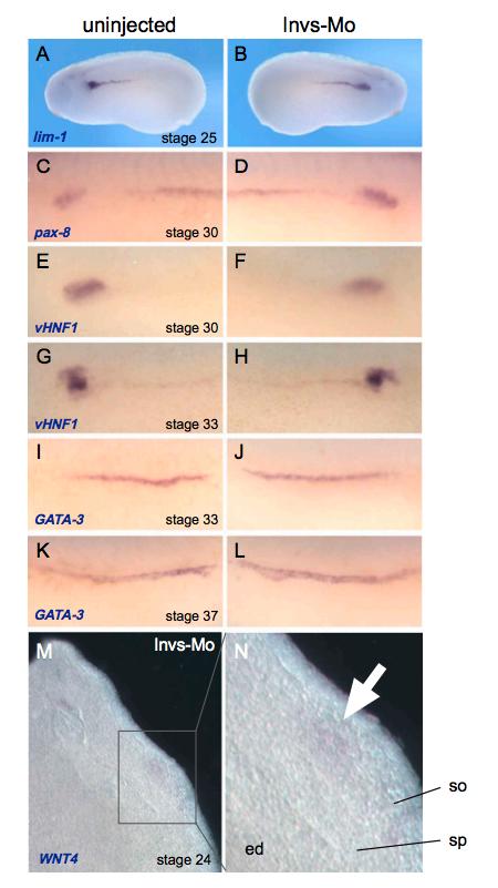 Fig. S3. Transcription factors characterizing the pronephros anlagen are unaffected by depletion of Inversin. (AâL) Unilateral injection of Invs-Mo at the fourcell stage was followed by whole-mount in situ hybridization against transcription factors that characterize the pronephric anlagen, including lim-1 (A and B), pax-8 (C and D), hepatocyte nuclear factor 1 homeobox B (vHNF1) (EâH), and the tubule-specific transcription factor GATA binding protein 3 (GATA-3) (IâL) at the indicated stages. No substantial differences were detected compared with the noninjected side. (M) In situ hybridization against Wnt4 visualized in a 200-μm vibratome section of an embryo. (N) The white arrow points to the in situ signal localized in the somatic layer (so) of the intermediate mesoderm. No expression was detected in the splanchnic layer (sp) or the endoderm (ed). This indicated correct polarization of the pronephric anlagen. |