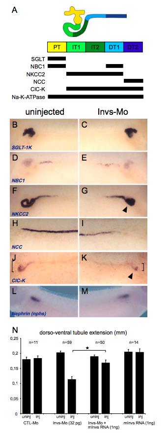 Genes referenced: atp1a1 axin2l clcnkb dnai1 dvl1 dvl3 epha8 fn1 fzd8 gata3 hnf1b invs jun lhx1 mapk8 nphs1 pax8 slc12a1 slc12a3 slc4a4 slc5a1.2 wnt4
