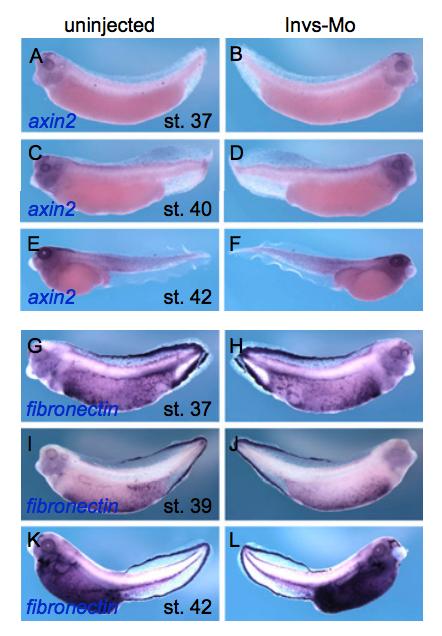 Fig. S5. Wnt target genes are not altered after knockdown of Inversin. Invs-Moâinjected embryos were fixed at indicated stages; in situ hybridization was performed against the canonical Wnt target genes axin2 (AâF) and fibronectin (GâL) |