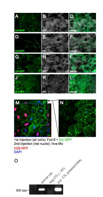 Fig. S8. Inversin is required but not sufficient for membrane localization of Dishevelled. (A, D, G, and J) Subcellular localization of Dishevelled-GFP (0.2 ng) in animal cap cells. (B, E, H, and K) DIC images were obtained to visualize cell borders. (C, F, I, and L) Overlay. (AâC) Dishevelled-GFP alone. (DâF) Dishevelled-GFP localizes to the plasma membrane on coexpression of Fzd-8. (GâI) Dishevelled-GFP accumulates in the cytoplasm if Invs-Mo and Fzd-8 mRNA are coinjected. (Jâ L) Dishevelled-GFP accumulates in cytoplasmic vesicles in animal cap cells that were only coinjected with Inversin-RNA. (M) Lateral view of a z stack of mosaic animal cap cells. All cells were injected with Dvl-GFP and Fzd-8; cells with red nuclei also received Invs-Mo and reveal reduced membrane-associated Dvl-GFP. (N) Optical section of the apical surface. (O) xInvs transcripts were detectable in animal cap cells by RT-PCR. |
