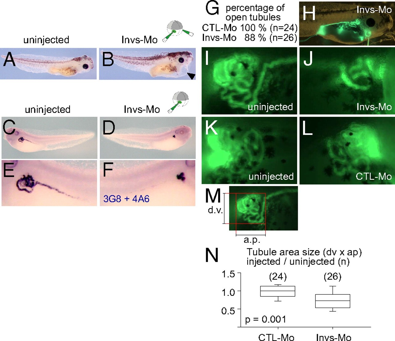 Fig. 1. Inversin is required for pronephric tubule development in X. laevis. (A and B) Bilateral injection of Invs-Mo at the four-cell stage resulted in severe edema. (C) The pronephros-specific antibodies 3G8 and 4A6 stain the entire pronephric tubule on the uninjected side. (D) On the Invs-Moâinjected side of the same embryo, staining is absent in the distal and intermediate tubule segment but is maintained in the proximal segment. (E and F) Enlarged view of the pronephros in C and D, respectively. (G) Percentages of embryos with unobstructed tubular excretion on both sides. (H) Fluorescent dextran (70 kDa) excretion shows tubule patency in Invs-Moâinjected embryos. (IâL) Enlarged views of the pronephros at the phase of maximal dextran excretion. Note the reduction in tubular coiling on the Invs-Moâinjected side (J) compared with the uninjected side (I). (K and L) Injection of control-Mo (CTL-Mo) did not interfere with tubule patency or length. (M) Tubule-area size was measured as depicted. d.v., dorso-ventral; a.p., anterior-posterior. (N) Ratios of injected vs. uninjected tubule areas of the same embryos. |