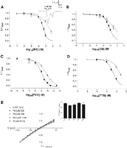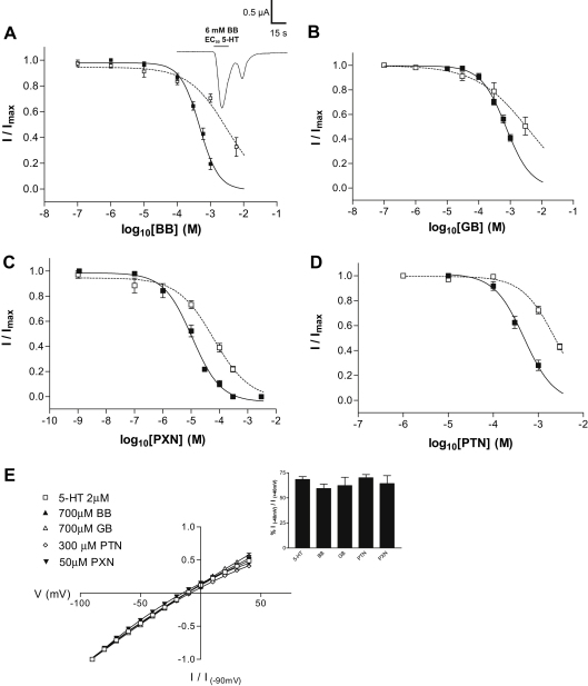 Fig. 2. BB (panel A), GB (panel B), PXN (panel C) and PTN (panel D) inhibition of the 5-HT3A (filled squares, solid line) and 5-HT3AB (open squares, dotted line) receptor EC50 responses. A inset shows the current rebound sometimes observed following the removal of high concentrations of BB. Panel E shows current-voltage relationships for 5-HT3A receptor responses in the presence of BB, GB, PXN or PTN. The curves have been normalised to the current at measured at −90 mV, and the inset shows the ratios of current amplitudes recorded at +40 mV relative to those at −40 mV. The ratios in the absence of antagonist were unaltered in the presence of BB, GB, PTN or PXN. GA inhibition is not shown as only minimal inhibition was seen at 1 mM in the 5-HT3A receptor only.