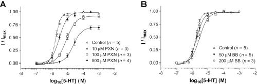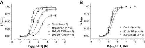 Fig. 4. Concentration–response curves in the absence and presence of increasing concentrations of BB and PXN. Increasing the concentration of PXN (Panel A), caused a rightward shift of the concentration-response curves and a change in maximal current that was consistent with non-competitive antagonism. Because of the low potency and poor compound solubility at high concentrations, it was not possible to perform experiments at higher concentrations and observe shifts for BB (Panel B) or GB (data not shown). Because of these limitations, inhibition of the 5-HT3 receptor response was recorded at single compound concentrations, both alone and in combination (seeTable 3).
