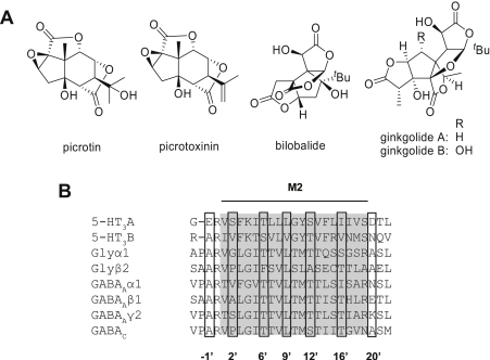 Fig. 1. Structures of the compounds used in this study (Panel A), and an alignment of human Cys-loop receptor M2 regions (Panel B). The alignment includes the human 5-HT3 receptor A and B subunits in addition to subunits from other Cys-loop receptors that are inhibited by BB, GB and PTX. M2 residues are usually referred to using prime (′) notation, which is shown below the alignment. Accession numbers for the alignment are: 5-HT3A (P46098), 5-HT3B (O95264), glycine α1 (P23415), glycine β2 (P48167), GABAA α1 (P14867), GABAA β1 (P18505), GABAA γ2 (Q8N1C3).