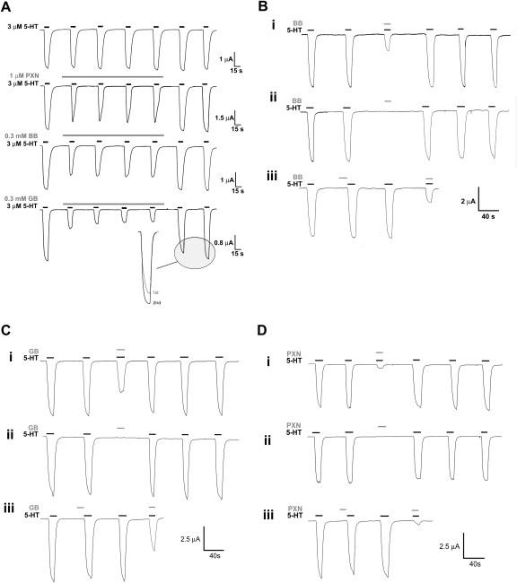 Fig. 3. Evidence for channel block. A: The use-dependency observed for GB was absent for BB and PXN. For GB, the percentage inhibition measure at peak (31 ± 3.1%) was less than that measured during the first application (38 ± 0.8%). For GB, full recovery was not seen until a second application of GB was applied (inset); at 0.3 mM GB, the first 5-HT response was 91 ± 2% of the second 5-HT response. B–D: The inhibition observed following the co-application (i) of each compound was not seen if the same compound was pre-applied before 5-HT (ii and iii). When compounds were pre-applied immediately before 5-HT (iii), no reduction in the 5-HT response was noted. 5-HT = 2 μM. BB = 1 mM, GB = 300 μM, PXN = 30 μM. For each compound, traces are representative of >5 experiments on ≥2 batches of oocytes.