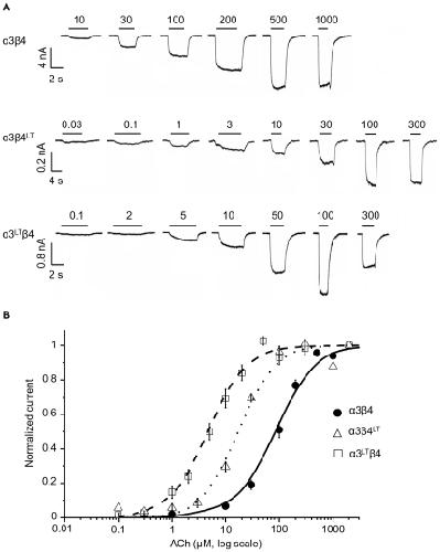 Figure 1. In HEK-expressed α3β4 receptors, the 9′LT mutation has a greater effect if inserted in α3.Traces in (A) are whole cell inward currents elicited by different ACh concentrations applied to cells expressing wild type (top), α3β4LT (middle) or α3LTβ4 (bottom) channels. The bars above the traces show the duration of the agonist applications and the agonist concentration (in µM). Cells were transfected with an α3 to β4 ratio of 1∶1 and held at −30 mV. Dose-response curves are shown in (B) for each receptor combination. The data were averaged after normalisation to the fitted maximum for each experiment. The lines show Hill equation fits (see Methods) to the pooled normalised data (n = 6–8).