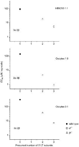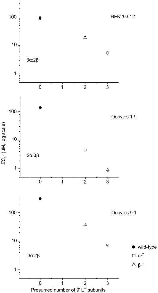 Figure 3. Relationship between the average EC50 values and the presumed number of 9′ LT mutations.Each point is plotted according to the stoichiometry we suggest for each cell type and subunit ratio. The assumed stoichiometry is stated on the plot. The linear relationship between the EC50 values and the number of mutated subunits confirms that the stoichiometry we assume is plausible.
