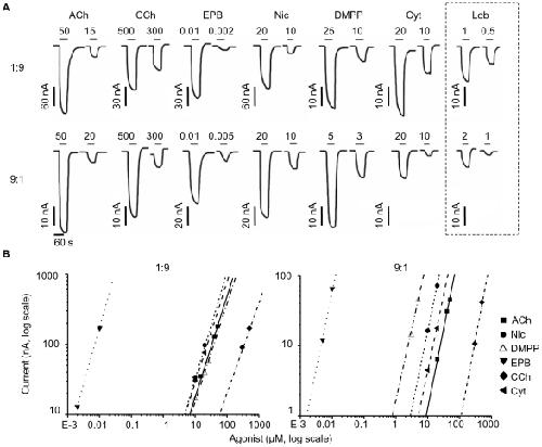 Figure 4. The two different receptor stoichiometries expressed in oocytes differ in their DMPP sensitivity.The traces in (A) are examples of inward currents elicited by low agonist concentrations (in µM) and recorded from oocytes injected with a subunit ratio of 1∶9 (top traces) and 9∶1 (bottom). The duration of each agonist application is shown above each trace (solid bar). All agonists (CCh, carbachol; EPB epibatidine; Nic, nicotine; DMPP, dimethylphenylpiperazinium; Cyt, cytisine; LOB, lobeline) were tested on the same oocyte (held at −70 mV), with the exception of lobeline (shown on the right, recorded from a different cell but with similar initial ACh current as the cell on the left, for both subunit ratios). The log-log plots in (B) are partial dose-response curves for the experiments shown in A (left). Note the increase in the potency of DMPP (10-fold leftward shift of the dose-response curve) in the 9∶1 ratio.