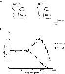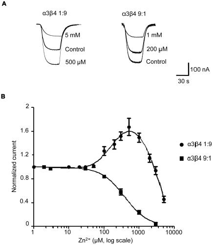 Figure 5. The two-α and three-α form of the α3β4 receptor differ in their response to Zn2+ modulation.Traces in (A) are typical currents activated by an EC20 concentration of ACh on the two-α receptor (left, 1∶9 α∶β ratio) and the three-α receptor (right, 9∶1 ratio) in the presence of increasing concentrations of Zn2+. Zn2+ was pre-applied to oocytes for 30 s before it was applied together with ACh. (B) Zn2+ concentration-response curves for the three-α receptor (filled squares) and the two-α receptor (filled circles). Curves from different cells were pooled and fitted to the Hill equation and to the sum of two Hill equations, respectively. Note that Zn2+ potentiated only the ACh responses of oocytes expressing the two-α stoichiometry.