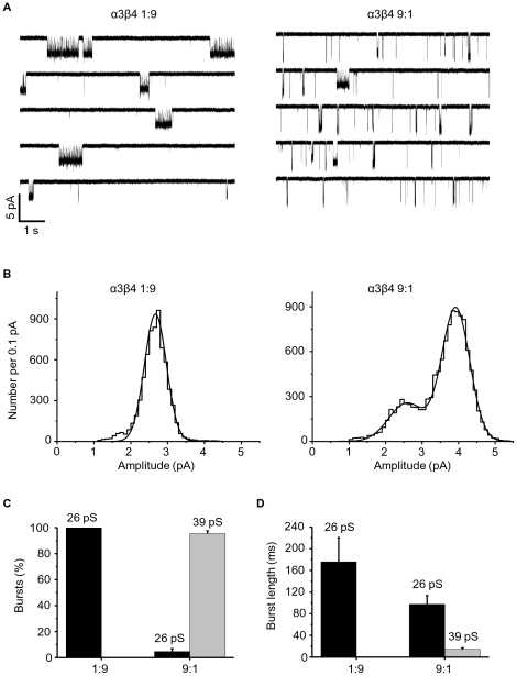 Figure 6. Single-channel properties of α3β4 receptors expressed from extreme ratios in HEK293 cells.(A) Examples of outside-out currents elicited by 5 µM ACh, from cells transfected with an α3 to β4 cDNA ratio of 1∶9 (left) and 9∶1 (right). Patches were held at −100 mV. The histograms of fitted amplitudes corresponding to these recordings are shown in (B). These are fitted with Gaussian curves to give the peak current amplitudes and the areas under each curve (for these two patches the values are 2.7±0.3 pA, area 100% for 1∶9; 2.6±0.5 pA, area 27% and 3.9±0.4 pA, area 73% for 9∶1). The histogram on the left (C) shows the proportion of bursts (as % of the total number of bursts from all experiments, pooled) at each chord conductance for the two subunit ratios. The histogram on the right (D) shows the difference in the duration of the bursts to different conductances for the two ratios.