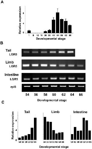 Spatio-temporal expression profile of stem cell-associated gene LGR5 in the intestine during thyroid hormone-dependent metamorphosis in Xenopus laevis.