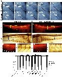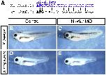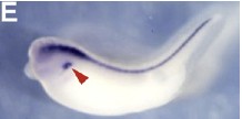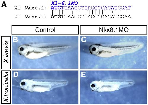Fig.4. Morpholino mediated knockdown of Nkx6 genes in X. laevis and X. tropicalis. MO design and morphology of MO injected tadpoles. (A) Alignment of Nkx6.1 sequences in X. laevis (Xl; top) and X. tropicalis (Xt; bottom) used for MO design. Vertical lines indicate identical residues and translation start codon is in bold type. Sequence targeted by Xl-Nkx6.1MO is shown in blue and is identical to the corresponding X. tropicalis sequence in 24/25 positions. (B) Uninjected stage 40 X. laevis tadpole. (C) Tadpole injected with 80Â ng Xl-6.1MO at the 1-cell stage is morphologically normal but paralyzed. (D) Uninjected stage 40 X. tropicalis tadpole. (E) X. tropicalis tadpole injected with 8Â ng Xl-6.1MO in both blastomeres at the 2-cell stage is morphologically normal but paralyzed, phenocopying the X. laevis injection in (C). |