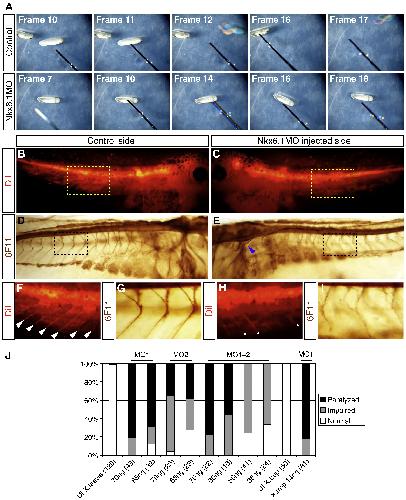 Fig.6. Nkx6.1 knockdown results in paralysis and axon misguidance. (A) Narrative frames from a time lapse series showing uninjected controls (top panel) and Nkx6.1MO injected embryos (bottom). Uninjected embryos initiate escape reflex when poked with a pipette tip (frames 12 and 17; pipette tip painted black). Poking of Nkx6.1MO injected embryos does not trigger escape reflex (bottom). Nkx6.1MO injected embryos were injected in both blastomeres at the 2-cell stage. (B,C,F,H) Orthograde DiI-labeling of stage 39/40 embryos injected unilaterally with Nkx6.1MO. (B) Control side showing labeled nerve fibers emanating from the neural tube. (C) Nkx6.1MO injected side show labeled nerves. (D,E,G,I) Immunostaining for N-CAM using antibody 6F11 showing axonal extensions. (D) Uninjected side of stage 39/40 tadpole showing nerve fibers protruding from the spinal cord and hindbrain. (E) Nkx6.1MO injected side of same tadpole does have greatly reduced and disorganized axons and cranial nerves are severely affected (blue arrowhead). (F, H) High magnification of boxes in (B) and (D), respectively. White arrow heads in (F) indicate DiI labeled axons. (H,I) High magnification of boxes show in (C) and (E), respectively. Asterisks in (H) indicate fluorescence from the uninjected side out of the plane of focus. (J) Effect of different MO1 and MO2 doses, individually and in combination, on tadpole mobility. Embryos were injected in all blastomeres at the one or two cell stage. Total MO amount injected is listed under bar. Number in parenthesis indicates number of embryos analyzed. MO1Â +Â 2 injections were performed with equal amounts of each. The two last bars show effect on MO1 when injected into X. tropicalis. Embryos were scored at stages 32â39. |