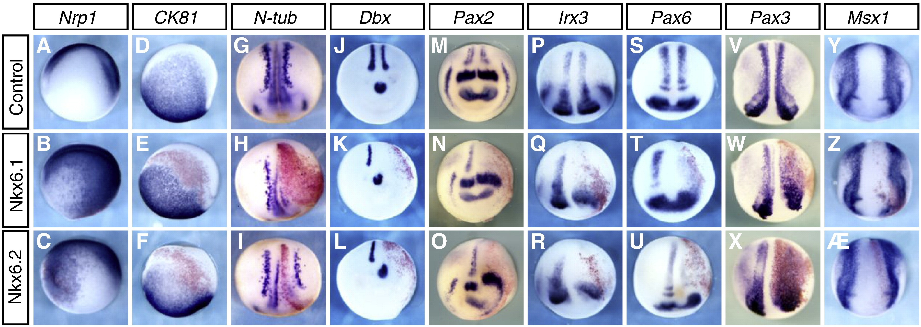 Fig. 2. Effect of Nkx6 mRNA injection on neural development. Gene expression patterns analyzed by whole mount in situ hybridization. Top row: uninjected control embryos. Middle row: embryos injected with Nkx6.1 mRNA. Bottom row: embryos injected with Nkx6.2 mRNA. Injected side is to the right and red stain indicate beta-galactosidase lineage tracer. All embryos are analyzed at stage 16, except embryos stained for Pax3 (VâX), which were analyzed at stage 17. (AâC) Pan-neural marker Nrp1 is expanded in Nkx6 injected embryos. (DâF) Epidermal marker cytokeratin-81 (CK81) is reduced in Nkx6 injected embryos. (GâI) Primary neurogenesis is inhibited by Nkx6 mRNA injected as visualized by loss of N-tubulin (N-tub) staining. (JâL) Dbx1 expression is inhibited in the spinal neural plate when embryos are injected with Nkx6 mRNA. (MâO) Spinal neural plate expression of Pax2 is repressed by Nkx6 mRNA, whereas the MHB is intact. (PâR) Spinal, but not rhombomeric, expression of Irx3 is repressed by Nkx6 misexpression. (SâU) Pax6 expression in the neural plate is repressed by ectopic Nkx6 misexpression. (VâX) Pax3 expression and Msx1 (Yâæ) expression is unchanged in response to Nkx6 injection. |