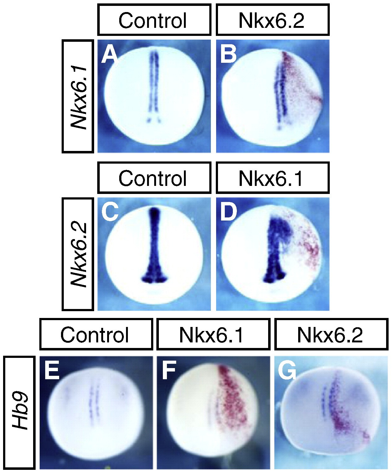 Fig. 3. Effect of Nkx6 mRNA injection on Nkx6 gene expression and MN formation. Nkx6 mRNA injected embryos analyzed by whole mount in situ hybridization at stage 17. Injected side is to the right and red stain indicates the beta-galactosidase lineage tracer. (A,C,E) Uninjected control embryos, (B,G) embryos injected with Nkx6.2 mRNA, (D,F) embryos injected with Nkx6.1 mRNA. (A,B) Nkx6.1 expression is not repressed in response to Nkx6.2 mRNA injection. (C,D) Nkx6.2 is not repressed in embryos injected with Nkx6.1 mRNA. (EâG) Embryos injected with Nkx6 mRNA do not form ectopic Hb9-positive MNs. |