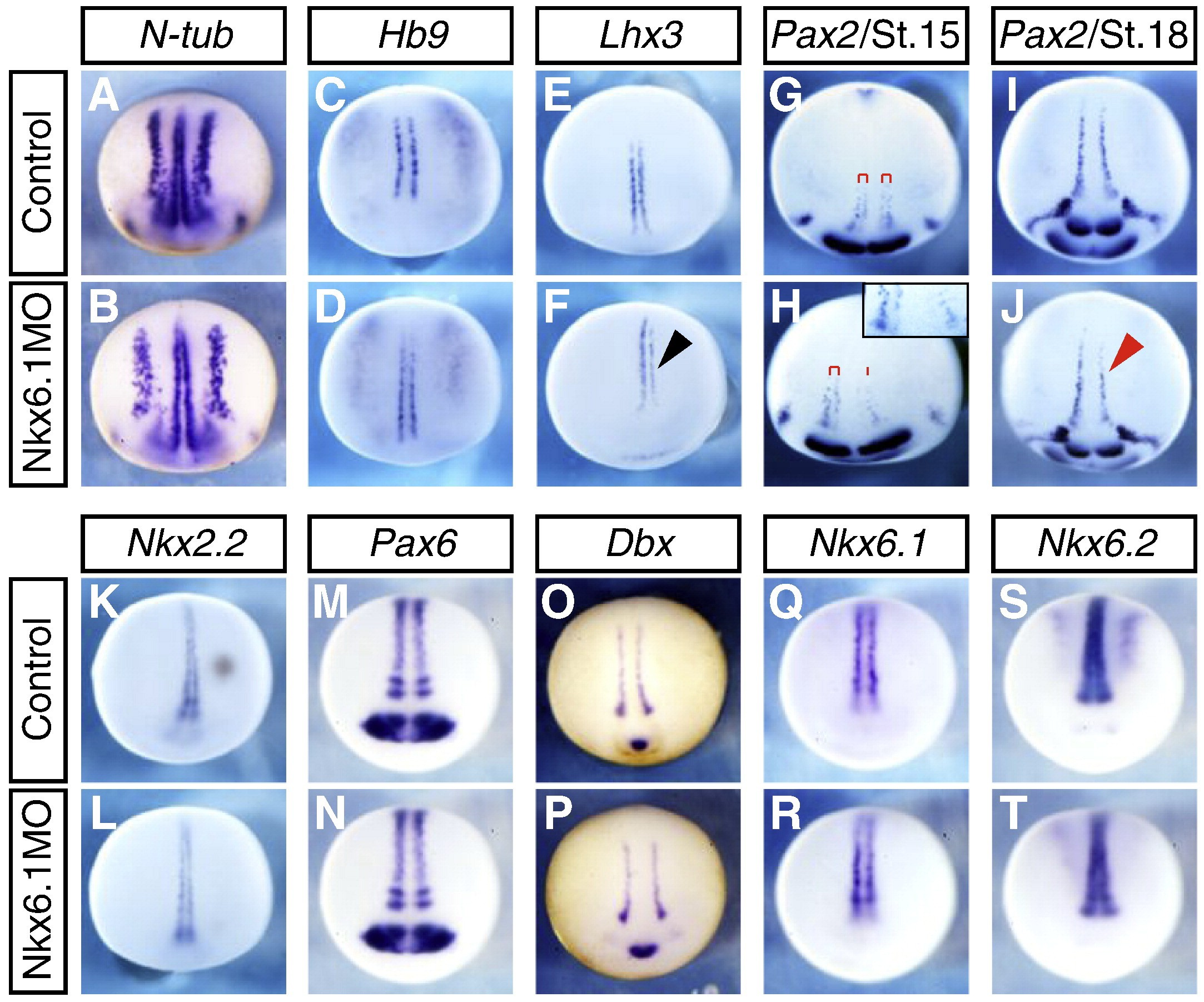 Fig. 5. Knockdown of Nkx6.1 has minor effects on neural plate patterning. Gene expression pattern in the neural plate of Nkx6.1MO injected X. laevis embryos. Top row shows uninjected control embryos, bottom row shows embryos injected with 37.5Â ng Nkx6.1MO in one half of the embryos. The injected side is to the right. (A,B) N-tubulin expression pattern marking primary neurons is normal at stage 16. (C,D) Hb9-positive MNs form normally in Nkx6.1 knockdowns (stage 18). (E,F) Lhx3-positive cells are reduced in Nkx6.1MO injected embryos at stage 16 (black arrowhead). (G,H) Pax2-expressing interneurons are reduced at stage 15. Red brackets indicate medial and lateral Pax2-positive stripes in the spinal neural plate. Only one stripe is present on the injected side (H and insert). (I,J) At stage 18 the spinal Pax2+ interneurons form one stripe that is reduced in response to Nkx6.1 knockdown (J, red arrowhead). Interneuron progenitor markers such as Pax6 (K,L), Dbx1 (M,N), and Nkx2.2 (O,P) are not affected by Nkx6.1 knockdown. Nkx6.1 is not required for its own (Q,R) or for Nkx6.2 expression (S,T). |