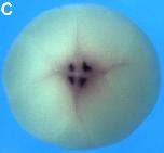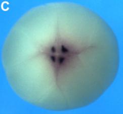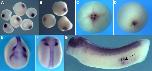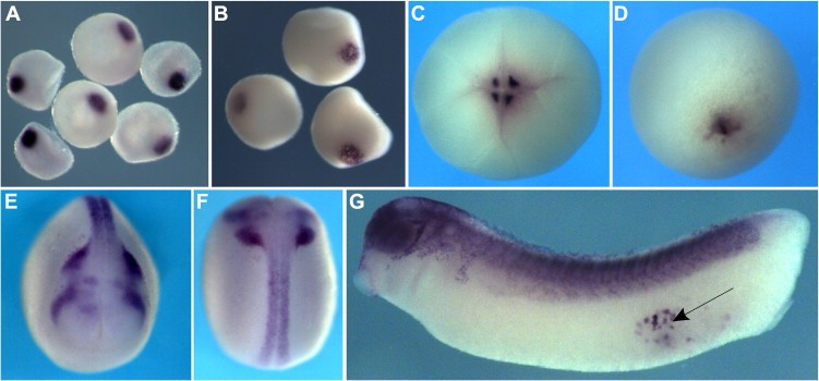 Fig. 1. xKIFI3B expression characteristics during oogenesis and embryogenesis. (AâG) xKIF13B mRNA was detected by whole mount in situ hybridization. During oogenesis, xKIF138 mRNA localizes to the tip of the vegetal cortex; A. early (stage II) oocytes; and B, late (stage IIIâIV) oocytes. At the 4-cell stage, xKIFI3B mRNA is enriched in the granular germ plasm islands at the vegetal pole (C, vegetal pole view). At gastrula stage, the transcript is detected in the region of the primordial germ cells (D, blastoporus view). During neurulation, xKIF13B mRNA starts to be expressed in the neural tube and in the cranial neural crest cells (E, anterior view, and F, dorsal view). At tailbud stage, xKIFI3B mRNA is expressed in PGCs (arrow), neural crest cells, brain, spinal cord and notochord (G, lateral view of the embryo with the head to the left). |