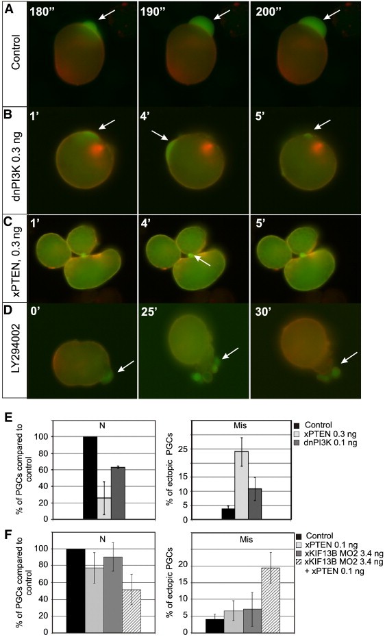 Fig. 4. Inhibition of P13K signalling affects PGC morphology and dynamics of protrusion formation. (AâD) Representative examples of membrane dynamics and PIP3 distribution phenotypes exhibited by cultured PGCs. Cells were isolated from embryos injected with 0.2 ng of EGFP_GRPIPH_DE mRNA alone (A),or co-injected with either 0.3 ng of dnPI3K_DE mRNA (B), 0.3 ng of xPTEN_DE mRNA (C), or incubated in 100 μM LY294002 (D). Images were selected from time-lapse movies acquired for 5 min in the 10 s per frame mode. Arrows indicate PIP3-enriched membrane extensions formed by PGCs. (EâF) Quantification of the phenotypic effects observed upon modulation of xKIF13B activity and PIP3 signalling. Average PGC numbers and mislocalization were calculated as described in the legend to Fig. 2. (E) Overexpression of xPTEN or of dnPI3K reduces average PGC numbers and leads to increased PGC mislocalization. (F) Synergistic effects of low doses of xKIF13B MO and dnPI3K on PGC number and mislocalisation. |