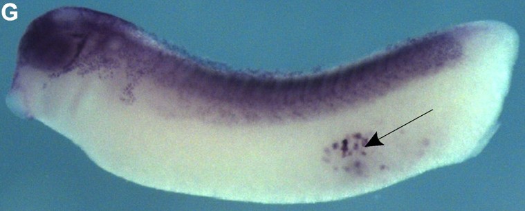 At tailbud stage (NF stage 28), kif13b mRNA is expressed in primordial germ cells (arrow), as well as the neural crest cells, brain, spinal cord and notochord. |