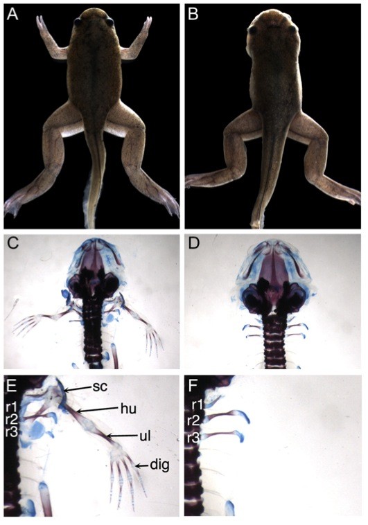 Fig. 1. A transgene insertion ablates all forelimb structures. (A) Metamorphosing froglets heterozygous for an Nkx2.5FP transgene show normal forelimb development while (B) homozygous siblings lack forelimbs. (C, E) Skeletal preparation of a wild type froglet showing limb skeletal elements including the scapula (sc), humerus (hu), ulna (ul), and digits (dit); clavicle is hidden beneath the scapula. (D, F) All forelimb skeletal structures, including the scapula and clavicle, are missing in xdm froglets, but the ribs are unaffected (r1, r2, and r3). |