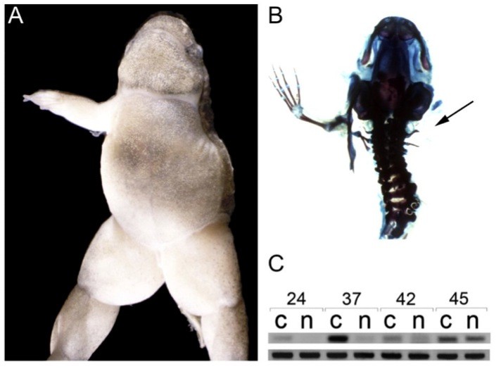 Fig. 4. Npnt knockdown phenocopies xdm. Npnt morpholino antisense oligonucleotides were injected into one blastomere of two-cell wild type embryos. (A, ventral view) Injection of two different non-overlapping morpholino sets resulted in unilateral forelimb ablation in a small but statistically significant number of metamorphosing tadpoles. (B) Morpholino knockdown ablating all forelimb skeletal elements, recapitulating the xdm phenotype. (C) Upper lanes, RT-PCR of control (c) and npnt splice-blocking (n) morpholino injected embryos indicates that npnt knockdown is virtually complete at stages 24 and 37, recovering at stage 42, and approaching wt levels at stage 45. Lower lanes, odc control. |