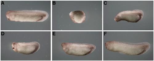 Fig. S4. Rescue experiments among Xfurry, Xfurry-MO, enR+LZ, and VP16+LZ. (A) Control (stage 33). (B) Injection of Xfurry-MO (5 ng/blastomere) into dorsal blastomeres of four-cell embryos interfered with head formation and shortened the axis of all embryos, as shown also in Fig. 1K (n = 40). (C) The cement gland was rescued, and the axis was slightly elongated by coinjection of Xfurry (2 ng/blastomere) and Xfurry-MO (5 ng/blastomere) into dorsal blastomeres of fourcell embryos (57.9%; n = 57). (D) Dorsal expression of enR+LZ (400 pg/blastomere) also rescued the phenotype of Xfurry-MOnjected embryos (78.6%; n = 56). (E) Dorsal injection of VP16+LZ (400 pg/blastomere) interfered with head formation and shortened the axis of all embryos, as in Fig. 2G (n = 40). (F) Dorsal expression of Xfurry (2 ng/blastomere) rescued the phenotype of VP16+LZ-injected embryos (52.5%, n = 59).