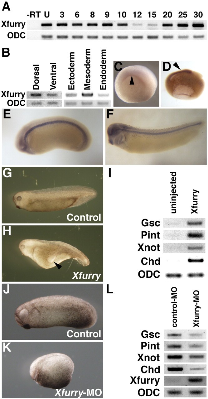 Fig. 1. Characterization of Xfurry. (A) Temporal expression of Xfurry detected by RT-PCR. Numbers indicate developmental stages. U, unfertilized eggs. (B) Regional RT-PCR of Xfurry at stage 10. (CâF) Whole-mount in situ hybridization. (C) Arrowhead indicates the dorsal lip (stage 10). (D) Arrowhead indicates the chordamesodermal region (stage 12). (E and F) Strong expression in the notochord was maintained through stage 25 (E) and stage 33 (F). (G) Control embryo (stage 33). (H) Xfurry (2 ng/blastomere) injected into ventral blastomeres of the four-cell embryo induced a secondary axis without anterior structures (arrowhead) in 63% of embryos (n = 60). (I) Expression of the chordamesodermal genes was induced in animal caps (stage 10) that were dissected from embryos injected with Xfurry (2 ng/blastomere). Gsc, goosecoid; Pint, pintallavis; Chd, chordin; ODC, Ornithine decarboxylase. (J) Control embryo (stage 26). (K) Injection of Xfurry-MO (5 ng/blastomere) into dorsal blastomeres of four-cell embryos shortened the dorsal axis in all embryos (n = 58). (L) Expression of chordamesodermal marker genes was reduced in Xfurry-MOâinjected embryos, but transcripts of Xfurry were increased by Xfurry-MO (stage 10).