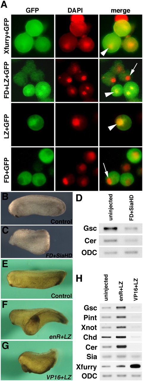 Fig. 2. Function of Xfurry as a transcriptional corepressor. (A) Fluorescent signals of Xfurry constructs in stage-10 mesodermal cells (Fig. S5). Red signals indicate cell nuclei stained with DAPI. (Top Row) Xfurry+GFP. (Second Row) FD+LZ+GFP construct. (Third Row) LZ+GFP. (Bottom Row) FD+GFP. Arrowheads show colocalization of GFP and DAPI signals. Arrows indicate noncolocalized signals. (B) Control embryo (stage 27). (C) Dorsal injection of FD+SiaHD interfered with head development. (D) Expression of FD+SiaHD reduced transcripts of goosecoid (Gsc) and Cerberus (Cer). (EâG) Phenotypes of injected stage-29 embryos. (E) Control embryo. (F) Ventral injection of enR+LZ (400 pg/blastomere) induced secondary axes in all embryos (n = 59). (G) Dorsal injection of VP16+LZ (400 pg/blastomere) shortened the dorsal axis in all embryos (n = 60). (H) Dorsal expression of enR+LZ induced chordamesodermal and headorganizer genes, and expression of VP16+LZ reduced those genes (stage 10).
